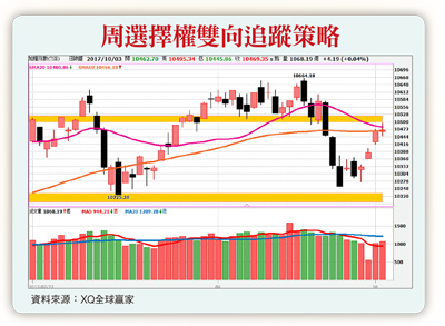 川普的稅改框架在共和黨上演大團結下,雛型終於確立,美股再次受到川普行情的激勵續創新高,其中RUSELL 2000在十月二日大漲一.二五%延續飆漲行情,畢竟中小企業將會是稅改受惠最多的族群,再加上美國九月份的ISM來到六○.八優於市場預期、以及在弱勢美元下,美股第三季財報獲利仍被市場看好,利多消息一波接著一波,預期美股的多頭格局將會延續到財報公布後,直到美元升息前。台股這波修正在一○二二五處的頸線獲得支撐,隨後每天開高墊高一路回到季線,但iPhone 8的電池膨脹事件遲遲未能獲得解決,訂單客戶拒收或退貨的情況也已甚囂塵上,台灣的蘋果供應鏈恐將暫時失去外資的寵愛,對大盤指數後續反彈不甚有利。從技術線圖來觀察,台股在十月三日來到了一○四六九點,但受制於月線的反壓,以及面臨一○五○○點上方的套牢區,多方反彈勢力顯然在此縮手退卻。配合均線來看,現在月線扣抵值仍高,短期之內指數若不回到一○五○○之上的話,月季線出現交叉將難以避免,指數即將面臨市場方向的表態。籌碼方面,十月三日外資在台股未平倉淨多單為四萬八千多口,相比起前日的五萬口略為回落。而自營商在選擇權的布局為Buy Call二萬八千多口,Sell Put五萬二千多口,和近期水平相比,是雙雙回落。整體來看,技術面承壓,籌碼部分,法人則是多單減碼,台股預期暫時進入整理階段。可用突破(買方跨式或勒式)策略進行佈局。