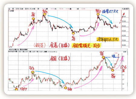 金居(8358)生產「電解銅箔」,為銅箔基板、多層印刷電路板關鍵材料,是全球銅箔前三大製造商。金居獲利和國際銅價波動息息相關,銅價從二○一一年每噸九九二○美元連跌五年至四四六八美元,金居也連續五年營運出現虧損,去年銅價大翻揚漲到年底五千九百美元,金居毛利率由八%逐步揚升到二六.一%,全年EPS更創下歷史新高三.○五元。今年銅價漲勢更強,金居上半年毛利率達二八.一五%,EPS更高達三.三二元,已超越去年全年,今年前九月營收五二.一二億,年增三七.六%,第四季是PCB傳統旺季,有利金居營運再提升。十月全球基本金屬價格再度飆漲,鐵礦砂漲一○%,鎳漲一六%,銅漲一二%,十月十六日收每噸七一二二美元,創三年新高。其中以銅的漲勢最強,因為LME(倫敦金屬交易所)銅庫存從二○一三年六十六萬噸降至今日剩二十八萬噸,超低庫存反映供給嚴重不足,更支撐銅價多頭趨勢。金居今年前三季EPS有達五元實力,全年可達六.五元,以十月十七日收盤價四九.八元計算,本益比只有七倍,相較於大盤平均本益比十六倍,具長線投資價值。金居是「光寶集團」、「光隆實業」及「致福集團」共同創辦,董監事及集團持股三九.一%,外資持股三%較低,九月二日辦現增認購價四七.八元成為支撐參考價。金居股價走勢和銅價同步(如附圖),如今銅價已創新高,接下來金居將有機會跟進。