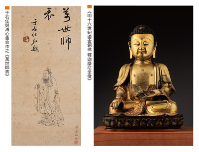 于右任、溥心畬合作孔子畫像王介生出身上海,父親為河北籍、母親為蒙古籍,有北方人豪邁性格,交友廣闊,黨政軍及藝文人士多有往還,與于右任更是忘年之交,往來間有許多書法餽贈之作,如《書法 放翁詩》、《書法 題民元照片二首》、《書法 八言聯》等,皆為市場上首見拍品。最值得一提的是于右任與溥心畬合作的《萬世師表》孔子畫像。眾所皆知,溥儒與于老雙方並不往來,且行事略有芥蒂,但因王介生與兩位皆有深交,故囑溥心畬完成孔子畫像並刊登於中央日報後,另請于老題字,作為私人收藏。此舉堪稱一絕,成為史上難得一見溥心畬與于右任合作之臻品,彌足珍貴。而《中日合作策進會前身》為日本親善訪問團來台會見蔣介石總統時,于右任親筆之書法手稿,足見中日友好關係,歷史及藝術價值兼具。還有胡適贈與王介生之親筆題字《荊公詩》,也具收藏價值。在瓷雜專場方面,最具代表性為《明十六世紀鎏金銅佛釋迦摩尼坐像》,出自佳士得二○一三年秋拍LOT377,為愛因斯坦專屬醫師Peter Hariolf Plesch教授一九二九年購自印度,雕工精細,法相莊嚴,袈裟衣帶裙襬邊緣,鑿花技術精湛,八百萬起拍。另外,蒐羅從戰國時期,經東、西漢到唐代的銅鏡,如《戰國 雙龍紋鏡》、《西漢 長樂未央鏡》、《唐 葵花二鳥紋 銀殼鎏金 掌中鏡》文飾精美,可窺見戰國隋唐藝術由精美走向成熟,生活與藝術結合的審美情趣。其他如《鱉龍如意 冰種春帶彩翡翠觀音》、《清 翡翠松鼠靈芝如意》拍品也相當精美,書畫方面值得關注的還有黃君璧《雲壑雷鳴》、江兆申《雲山清蔭圖》及臺靜農書法,藏家可多留意。
