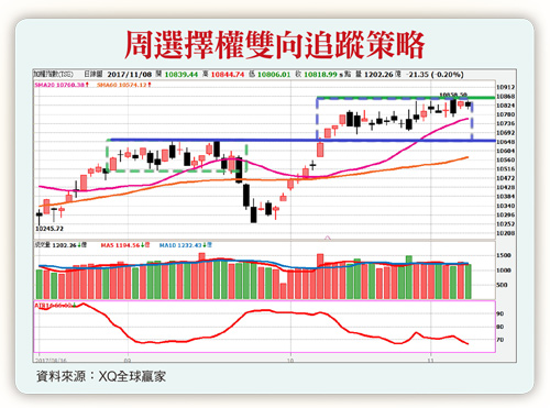 金融市場在沒有意外的情況下度過了一個數據與事件的超級週,首先,鮑威爾被提名為下一任FED主席,這位現任理事在貨幣政策的立場偏向鴿派,市場預期他將延續葉倫的緩升政策。再加上又是位資深共和黨人,較容易為國會成員接受,完全符合川普現在的施政需求。台股現在繼續面臨尷尬的窘境,無論是從景氣燈號即將邁向擴張的黃紅燈,還是出口數據創新高來看,台灣的經濟表現都是向著成長的方向前進,但加權指數就是維持在高檔處來回震盪。其實從股市市值與GDP觀察,該數值超過一六○%代表股價被高估,而台股市值/GDP已經高於一八五%,相較於美股的一三七%台股的基期是偏高的。股市是經濟的先行指標,這也提醒我們,這一輪的經濟數據其實已經反映在先前的上漲,台股要再更上層樓,就需要更強力的經濟成長動能來推動。消費市場旺季已從傳統的聖誕節提前到電商所炒熱的雙十一,這份熱度能不能感染到台股,就從籌碼來觀察,先看外資在期貨未平倉部位,八日淨多單來到四萬六千多口,呈相對低點。接著看自營商在選擇權的未平倉部位,Sell Call六千多口,Sell Put九萬多口。整體來看籌碼立場呈現中性的觀望狀態。十一月台指期將在十一月十五日結算,從大盤技術面觀察,ATR持續下降至七十以下水平,在行情收斂情況下,市場容易出現噴發,波動屆時將會放大但方向卻不定,可以用突破(買方跨式或勒式)策略來追蹤。