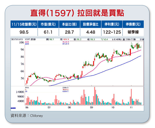 直得(1597)為全球前三大微型線性滑軌元件製造商,產品營收比重︰微型線性滑軌六五~七○%、標準型線性滑軌二五~三○%及線性馬達五%。標準型產品主要應用在自動化設備與較大型機台(毛利率約二五%),微型線性滑軌屬利基型產品(毛利率可達四五%),產品主要應用在半導體、面板、LED、醫療等較為精密的機械設備,線性馬達模組毛利率則超過五○%。直得台灣市場約佔營收四成多(其中約五成透過經銷商外銷至新加坡、韓國等,內銷以國內半導體、光電等設備大廠為主),大陸市場佔三成,歐、美合計也占約三成。受惠中國產業升級,半導體與面板產業擴廠需求加溫,以及工業機器人等新應用陸續浮現,直得第三季毛利率季增二.二個百分點來到四二.四六%,EPS一.三七元遠優於預期,加上十月營收雙升(月增一一%、年增九八%)創歷史新高,在營收規模與產能利用率持續提升下,明年營運及獲利可望再上一層樓。直得目前在手訂單需要超過三個月消化完畢,面對當前產業供應短絀,直得已著手添購機器設備可望於第四季增加一五%產能,挹注營收與毛利率成長。基於自動化浪潮來襲,產業趨勢不斷向上成長,加上訂單能見度已看到明年下半年,後續成長動能值得期待!【操作建議】股價於八月十八日正式向上突破三角形整理結構後,就以漲一段、休息一段、再上漲的「階梯式」漲升結構行進著,因為每漲一段就換手一次,中線籌碼十分安定,在量價結構未異常前,任何拉回都是買點。