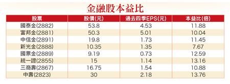 就像很多的金融股,就價值的角度來看,也有被低估的情形,如附表新光金(2888),目前本益比僅七.六七倍,國泰金(2882)、富邦金(2881)、中信金(2891)等都只有十一倍左右,統一證(2855)雖然是十三倍,但由於已於年初獲准赴中國參股投資「金圓統一證券」四九%股權,十月營收月增一六三%、年增四四七%,在大陸股市近期非常火熱的情況下,給予較高的評價也不為過。美元由貶轉升 助益壽險海外投資對於今年台灣的金控股而言,政策上對於壽險資金的鬆綁,讓其可運用更多的資金參與投資,以國泰人壽來說,至十月底金融資產未實現利益達一千二百億元,其中股票貢獻四成,今年前九月台股年化報酬率一○.六%,配置台股有四三七○億元,比重八.二%;國外股票三四五○億元,比重六.四%,報酬率八.八%,表現不俗。另外再加上美元開始因FED政策上的關係,由貶轉升,這對於壽險的海外投資部位,更是正面加分。