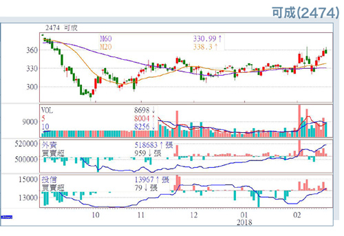中碳(1723):受惠國際油價推升苯價上揚,使得澳洲等許多下游客戶積極提貨,單月產量拉升至歷史新高的七千噸依舊供不應求,在苯量價均增之下,結算二○一七年十二月份合併營業利益一.八二億元,合併稅前獲利二.○六億元,年成長達八成。而二○一七年全年在軟瀝青報價走揚、石墨電極需求報價均有撐之下,合併稅前淨利十三.六五億元,每股稅前盈餘五.七六元。南亞科(2408):二○一七年受惠於DRAM市況熱絡,合併營收達五四九.三二億元,年增三二.九%,且由於銷售價格走升,全年毛利率達四四.九%,營業淨利為一八八.○二億元。法人認為,南亞科有機會今年再賺超過一個股本。近期外資對其已連六買,累計買超逾三.一萬張。可成(2474):二○一七年第四季Apple推出i8/Plus及iX,由於新款手機整體工序較為繁複,使得新款機殼之整體ASP上揚,第四季營收三二七.九五億元,創歷史新高,季增一九.六%、年增三六.六%,法人預期第四季EPS可達到十元以上。中租-KY(5871):一月自結稅後淨利創歷史新高,法人預期受惠一般提存率降低及放款持續成長,看好中租今年獲利仍可望繳出雙位數成長佳績。中租東協布局已經涵蓋泰國、越南、馬來西亞、柬埔寨,今年取得在菲律賓營業牌照後,東協布局更趨完整,中租相當看好當地中小企業商機,初期業務將以車輛融資為主,耕耘當地中小企業融資服務,發展成長契機,增加東協地區營收占比。