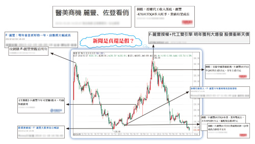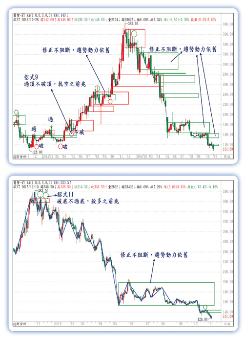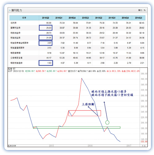 無論新聞是真是假,若能以「箱波均」來檢驗,即能在高檔處出場、低檔處提早進場。從第一張周線圖可看出下跌的趨勢仍舊未結束。若想要更快抓到趨勢轉折的關鍵,也可從小一級的日線切入。第二張圖為二○一五年十二月初趨勢轉空開始時,日線早出現兩次止漲缺口,且第二個缺口又符合招式十一,破底不過底,殺多之前兆,二○一六年五月到十月作了修正,為二十日修正,但修正不阻斷趨勢動力依舊,還沒有看到止跌缺口或下跌阻斷的跡象。試著找尋麗豐最近的新聞,有什麼題材呢?找到兩則新聞,我對這些新聞的解讀是看好麗豐,有利多的消息。財經新聞常影響投資人作判斷,就以我朋友的親身經歷,他買進的股票已經漲了很多,也出現了他該出場的訊號,但當時新聞還不斷的有利多的消息,決定繼續抱著,最後的結果就是把大部分的獲利都吐回去了,所以身為投資人,應該思考新聞告訴大眾是真的還是假的,利多是真的利多還是利多出盡呢?從附圖找出麗豐多空趨勢轉換的關鍵處新聞,對照周線圖,試著思考看看,哪些新聞是真?哪些新聞是假?其實,無論附圖上的新聞是真是假,若能以「箱波均」來檢驗,即能在高檔處出場、低檔處提早進場,在二○一五年六月二十一日的新聞裡,有麗豐的好消息,這新聞就是真的,不過早在五月,箱波均已經出現招式九過頂不破頂的軋空訊號了。接著再以麗豐的基本面來檢視,附表可看出二○一六年第二季的營業利益率、稅後純益率、稅後股東權益報酬率及每股稅後盈餘都創了歷史新低。在五月至十月間有作二十日級數的修正,視為反彈,第三季的報表,應該會比第二季進步一些,但因為只是修正並未阻斷,仍然是下跌的趨勢。最後再附上麗豐月線圖,月線圖出現殺多及重回空頭的訊號,許多投資人會想說這檔股票目前已經比以前的低點還便宜,想趁現在逢低買進,但現在還不是買入的時機!下跌趨勢可還沒結束啊!等到止跌缺口或下跌阻斷再來買就好了。