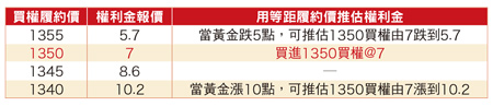操作海外選擇權,除了最簡單的買進選擇權,當慢慢比較進階後,就開始理解到選擇權的「非線性」特性。投資人最常遭遇的困難是判斷當標的商品漲跌多少點數時,手上的選擇權權利金會跟著漲跌多少點?例如看好黃金,買進一口黃金買權,同時以技術分析來講,黃金期貨估有十點的漲幅空間,那麼對照過來手上的買權會漲幾點?也就是停利單要設價多少?雖然嚴格講起來選擇權操作是很精密的事業,不過本文將介紹比較簡易的關於權利金漲跌幅度的判斷方式,方便一般投資人在即使手邊試算工具缺乏的情況下,仍可快速預估權利金的變化。承上面例子,假設買進的是1350黃金買權@7點,如何先估算出黃金期貨漲十大點時,1350黃金買權會漲到哪個價位?一個簡單的方式就是看看當下1340(1350-10=1340)黃金買權權利金報價多少,假設是報十.二點,就可推估當黃金期貨漲十點,1350黃金買權約漲到10.2點,停利單就可據此設價掛出。反之假設黃金期貨將跌五大點,則1350黃金買權的未來價格就要參考履約價1355(1350+5=1355)的權利金價格,假設是五.七點,就可做為停損參考點。再舉一個例子,這次換買進1330賣權@8.8點,當黃金期貨跌五大點時,權利金會漲多少?此時可參看1335(1330+5=1335)的賣權報價@11.2,就可以估算出約有二.四點的漲幅。以上方法,同理可證,以此類推,但特別留意,影響權利金漲跌的因素很多,例如還有預期波動率的變化等,上述方法只能算是粗估,此外,考量時間價值因素,用來推估近一兩日行情是比較準確的。◎欲進一步了解海外選擇權,歡迎參觀統一期貨官網「海外選擇權教學全攻略」專區。