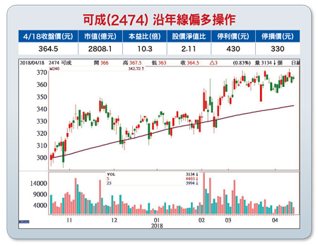 前陣子三月底、四月初,當全市場因iPhone X銷售不佳而紛紛下修蘋概股的目標價時,我們再度獨排眾議在三千元附近喊買第一季財報利空將出盡的股王大立光,果然從四月九日三千元短短幾天時間就強彈近二成來到三五七五元。不過,因為蘋概股上中下游供應鏈的關係,以及今年i9的佔比不同,因此每一檔蘋概股的營運落底時間將有所不同,而且未來觸底彈升幅度也會差很多。可成(2474)二○一七年每股盈餘為二八.三五元,預計配息十二元。受惠上半年個人電腦(PC)需求很強勁,行動裝置需求也高於去年,今年第一季營收二○四億元,雖較去年第四季旺季減幅三七.八%,卻較去年第一季成長高達四成。可成今年擴大蘋果產品供貨比重至於今年新款iPhone 9,法人預估六.五吋LCD版本量能將超越其他兩款OLED新品,LCD版將占下半年產品組合達四○%,OLED五.八吋占比二五%至三○%,六.五吋OLED版比重約三○%至三五%。其中可成將拿下LCD版iPhone 9約七成訂單,今年可望進一步擴大在蘋果產品的供貨比重,預估今年EPS可挑戰三十八至四十元,再創獲利新高。