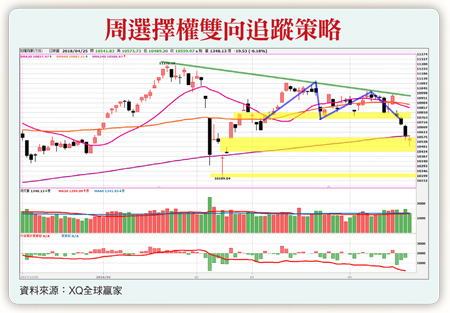 美國十年期公債再見三字頭,長短期公債利差也來到十年新低的○.四九%,經過二月份的教訓,投資人的風險情緒也再度拉高。而原先市場期待財報能為美股帶來利多突破,卻也因科技族群頻頻下修今年營收預期而失望,第二季金融市場顯然仍不平靜。台積電法說會終於成為壓垮駱駝的最後一根稻草,外資二十日當天大賣台積電七.一萬張是人人皆知,政府基金自然不會在這關頭進場承接,於是在外資離場無人護盤的環境下,台股連日修正一路跌破一○八○○點密集區支撐,隨後再跌破年線一○五八六點,並進入二月十二日多方缺口尋求支撐。從資金流向來看,美元兌台幣已從上個月底的二十九.一來到二十九.六五九元,資金流出台股動作已相當明顯,六月A股將納入MSCI,更會排擠到回流台股的海外資金。由籌碼角度分析,外資在台指期未平倉部位,四月二十五日以調節到二萬八千口的水平。接著從自營商的選擇權未平倉部位來看,Sell Call三萬九千多口,Sell Put也從三萬多調節至一萬多口水平,顯然不論外資、內資,立場都偏向保守。整體來看,技術與籌碼皆偏向保守,從形勢上是有大跌(買進賣權)策略可以作為這波修正的避險策略,但由於連日修正,使得Put隱波率居高不下,因此目前權利金是屬於偏高的狀態。此時可利用溫跌(賣權空頭價差)策略作為追蹤指數的工具,一方面壓低成本,同時也可避開時間價值的損失。