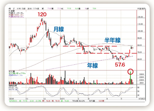 橘子(6180)遊戲軟體族群。去年十二月再度代理人氣遊戲「天堂M」上市,當月營收十六.六六億,月增二○八%,年增一五○%,之後連續五個月營收年成長都是倍數以上。統計今年前四個月營收六一.五四億,年增一二○%,今年肯定是高成長年。橘子二○○二年上市,當時也是代理人氣遊戲「天堂」獲利一個股本,股價漲到一九七元,後來因為沒有大製作遊戲,導致近十年來獲利都不突出,今年再度代理「天堂M」,首季EPS就高達二.四一元創單季新高,今年橘子將會重返榮耀。遊戲軟體產業每年在暑假(七、八月)及寒假(一、二月)都是玩家的旺季,營收都會比平常時間增加二○%以上,尤其「天堂M」目前是最高人氣的產品,讓市場期待值更高。今年以來橘子股價由一二○元跌到五七.六元,近期站穩年線六五.六元,加上首季財報發布後再度吸引投資人進場,本月一度漲到八○.五元,如果以今年EPS十元預估值計算本益比只有十倍。近期成交量轉為熱絡成為市場熱門股,目前支撐提高到七十元平台,月線在六十六元,年線在六五.六元幾乎重疊,上檔壓力在半年線八十一元,只要突破後就有機會再加速上漲。橘子股本十七.五億,董監事大股東持股四七.五七%,法人持股一二.九三%仍具籌碼優勢。五月十八日成交量四萬四八五○張,近期只要半年線站上代表換手成功。