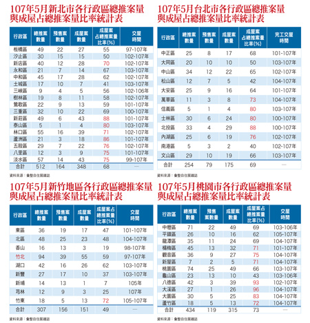 去年在建商普遍讓利,導引自住需求支撐下,買賣移轉數量略微回升至二六.六萬戶,今年以來備受關注的推案量與銷售率議題也持續延燒至三二九檔期,至於當前一般民眾最想知道的是,房市真的回溫了嗎?根據主管機關最新資訊,國銀房貸餘額去年增加二四九九.○三億元,年增三.八四%,創近年新高,因此行庫主管咸認今年房市可望持續回溫,交易量亦可能再呈現微幅增加趨勢。此外,根據內政部統計資訊,全台受僱不動產經紀人在去年三月減少至八○二六人,最近一年增加近二百人,受僱經紀營業員亦增加約一千人,因此,相關業者也趁勢不斷釋出景氣回溫並且即將復甦訊息,以期順利去化餘屋。其實當前大家所關注的焦點除讓利之外,究竟多年來所推出那麼多的案量銷售了多少?房價何時止跌?另一方面,投資客手中大量存貨是否繼續持有,待價而沽!以下謹就此一議題彙整提出相關數據(詳請參閱附表),只要逐一詳加解讀,即可輕易解開景氣何時落底之盲點!一、依住展雜誌統計資料加以彙整,截至今年五月,台北市、新北市、桃園市與新竹地區總推案量合計一五○七案,其中成屋九八九案,占六五.六%,亦即成屋數量約占三分之二;並且還有民國九十七年完工之成屋延續至今尚未完全出清,尤其是一百年以後逐年累積的數量更是龐大。由此不難了解在大量餘屋尚未出清前提下,今年以來建商讓利依舊,新建案推案量大幅萎縮之原因所在。二、台北市:總推案量合計二五四案,其中成屋一七五案,占六九%。值得關注的是,萬華區與內湖區成屋案量占總推案量比率分別高達七三%、七六%,信義區與士林區八○%,北投區更高達八八%。至於待售成屋之完工時間大都介於一○一至一○七年。三、新北市:總推案量合計五一二案,其中成屋三四八案,占六八%;並且新店區、林口區、五股區、八里區與淡水區成屋案量占總推案量比率均超過七○%,新莊區、泰山區與蘆洲區亦皆超過八○%。至於待售成屋之完工時間大都介於九十七至一○七年。四、桃園市:總推案量合計四三四案,其中成屋三一五案,占七三%;並且楊梅區、觀音區、新屋區與蘆竹區成屋案量占總推案量比率皆超過七○%,大園區八三%,八德區與大溪區更分別高達九三%、九六%。至於待售成屋之完工時間大都介於一○一至一○七年。五、新竹地區:總推案量合計三○七案,其中成屋一五一案,占四九%;並且竹東成屋案量占總推案量比率高達七二%。至於待售成屋之完工時間大都介於九十七至一○七年。由以上分析,當可了解現階段除非是地段區位良好之建案,否則在大量餘屋尚待去化情況下,讓利應該還會持續一段時間,尤其是在購屋者預期心理依舊濃厚情況下,觀望期間勢必隨之拉長。因此,可以肯定的是,今年房市景氣仍舊見不到底,至於龐大成屋去化恐還需五年以上時間!