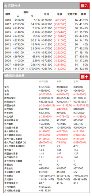 RSI順勢策略在RSI順勢策略架構下,RSI值站上80買多單,跌破20進空單,執行出來的績效如圖三與圖四,發現主要獲利來自做多,甚至做空變成拖垮風險報酬比的動作,我們將這樣的特性記錄下來,再看之後的變化。RSI逆勢策略在RSI逆勢策略架構下,RSI值由下往上穿越20買多單,由上往下跌破80進空單,在開發逆勢策略做最佳化時,假設以風險報酬比當篩選標準時,得出的參數與表現就會變成圖五,獲利也都集中在執行多單時,逆勢逢低買的做法是可行的,但是交易次數變成非常低。綜合以上,歸納出以下幾點:(1)RSI順勢策略獲利空間較大,尤其多單。(2)RSI逆勢策略獲利空間較小,也是集中於多單。(3)順勢與逆勢,適用參數不同。RSI順勢逆勢切換策略我們簡單做一個交易濾網做為順逆切換的開關,這個濾網最簡單的就是均線濾網,也可以是波動度濾網或是箱型濾網,並分別最佳化順逆策略的參數(因為趨勢盤屬性跟盤整盤屬性本來就不同,因此順逆勢策略兩者的參數不適合通用),圖六與圖七的測試結果告訴我們,的確藉由順逆策略切換的做法,風險報酬比能有所提升,是個有效的組合作法。除了策略的主體外,我們再加上一些停損停利的動作,完成這支RSI策略,從圖八、圖九、圖十讀者可以發現,多空交易的比例均衡了,回測數據能達成每年都是正獲利,而且勝率也不錯,以單策略來說,這樣績效數據算很好了。總之,已經流行多年的RSI指標,不但仍在繼續普遍使用中,還可以不斷的變形,產生新的操作模式,得到更好的績效或更廣的使用範圍。