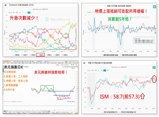 全球金融市場從六月開始將進入一連串的貿易戰以及利率戰的洗禮,因此筆者預估六月份的金融市場仍然不會太平靜,六月一日川普針對歐盟、墨西哥以及加拿大的鋼鋁關稅調漲,日本、韓國同樣無法倖免於難。看起來美國並不是只有針對中國,而是想利用關稅壁壘將減稅、擴大政府投資的紅利給留在美國國內,現在又碰到原油上漲催升通膨壓力,為了怕抵銷美國消費力,因此更積極地想留住這個紅利。美股最強就是整理不過,從剛公佈的美國第一季GDP調整過後的數字來到二.二%,相較修正前呈現明顯下滑,再從消費者占GDP的貢獻度來觀察,可以發現到五月的消費力道出現了明顯的下滑,且創下五年以來新低,顯見其實油價的上漲所帶來的通膨壓力正在一步步的抵銷政策所帶來的紅利。雖然在五月的ISM製造業指數公佈之後出現了回升現象,不過以ISM指數的領先性來說,在沒有越過年初的高點之前,美股預估只是維持在整理的格局。歐盟內外交迫回顧過去兩個月,金融市場受到美元升值以及歐債風暴的影響,在走勢上都出現些許轉折,德、法股市在來到高檔之後開始出現回跌,反映的除了歐債風暴之外,還有美國對歐盟的貿易戰,而川普甚至把戰場擴大到汽車產業,點名不想在紐約看到雙B的車!對歐盟來說內有歐債風暴、外有關稅貿易戰,考驗的不只是歐洲央行的利率政策,甚至也威脅到了歐盟整個體系未來會否分崩離析!尤其在再次發生歐債風暴之後,市場上開始出現要讓義大利脫歐的聲音,後續發展雖不確定,但至少在歐央的態度上,縮表、緊縮資金是不可能了,歐元預估將可能在歐央的引導下維持弱勢用以創造寬鬆環境來提高流動性,避免風險發生。去槓桿角力 美國強勢主導其實,歐債風暴帶出更深層面關於美國發動貿易戰的本質,就是去化槓桿這件事,美國、中國、歐盟、日本甚至英國都準備開始緊縮資金,去化槓桿,但如果現在全球又再次出現資金同步緊縮,試問會發生什麼情況呢?簡單來說,全球金融市場會出現流動性風險,所以資產將會出現無量下跌的現象,因為資金在一夕之間就被抽光,企業瘋狂倒閉潮等。雖然美國已經領先其他經濟體升息、縮表,但卻還沒有明顯見效,若是此時其他主要經濟體都同時緊縮,那將會造成美國企業經營出現壓力,所以川普發動貿易戰創造出讓各國不能緊縮的環境,才能讓美國順利去化槓桿,等美國去完之後,其他的再說吧!台股風險仍在操作保守美元升值反映的除了殖利率上反之外,其實相對地也反映出其他貨幣的走貶,交相反應之下,美元出現了跌深的報復性反彈,這個強勢反彈造成新興市場資金外逃,台股也不例外,雖然台灣本身體質很強健,但外資在面對新台幣的貶值壓力下還是不得不調節台股,再加上今年科技產業沒什麼新亮點,自然對台股就興趣缺缺。到現在為止,筆者仍然認為台股還是保守觀望為主,電子股短線跌深反彈,金融、傳產整理,六月台股將面臨更大的危機,操作上還是要小心風險!