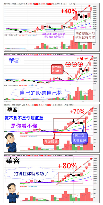 目前行情已經發動事後看到都來不及了,但彭哥在新聞尚未發布時就已經抓到轉折,在好的轉折訊號進場就不容易被洗掉,加上短時間快速拉開價差脫離成本,也符合沒跌破任何一個上升趨勢角度的低點,實為一個短期內就可以財富翻倍的操作範例。最後我們就來看連日追蹤華容的追蹤圖,這都是當下行情發生時我們截圖的內容,賺錢是不是就該要有這樣的態度跟做法呢?這些內容盤中彭哥都在Line@群組讓上千名粉絲同學做驗證,敢說敢做這才是一個成功投資者應有的特質,至截稿日(六月十二日)華容漲停仍持續發生,到底要漲到何時呢?彭哥將繼續為大家追蹤,敬請期待!