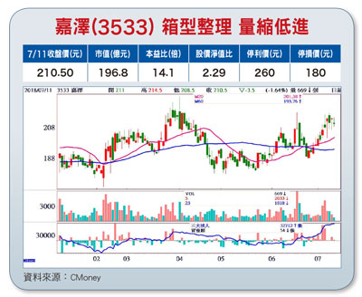 嘉澤(3533)是連接器廠,產品主要應用於桌上型及筆記型電腦主機板,應用比重分別為:桌機四六%、伺服器二三%、筆電一五%、Thunderbolt(嘉基)約佔一○%、USB Type C約佔六%。受惠伺服器換機潮帶動,嘉澤六月營收十一.五五億元,連續第二個月刷新歷史紀錄,由於伺服器產品利潤高於平均值,隨著出貨占比增高,將拉動嘉澤第二季毛利率向上、挹注獲利。此外,子公司嘉基去(二○一七)年已見轉機(獲利七千二百萬元),上季陸續接獲兩家國際大廠訂單,下半年另一國際大客戶也將出貨,預期營收及獲利將同步成長,並開始貢獻母公司獲利。嘉澤今年營運持續受惠於英特爾及超微兩大客戶加持,其中,英特爾去年下半年推出新的伺服器平台Purley帶動轉換需求,包括企業換機以及數據中心建置,帶動伺服器及周邊零組件需求強勁,目前Purley伺服器平台市場滲透率約二○%,相較於去年底的一○%翻倍成長。根據歷史經驗,伺服器新平台推出後需要一段時間發酵,推算今年將進入換機升級的時刻,預估該平台在數據中心滲透率今年底有機會達九○%,整體滲透率將達五○%,出貨動能在第三季達最高峰。由於英特爾Purley平台已於上季開始加速轉換,下半年該新平台如有降價機會,將快速推動終端換機需求,加上超微Zen新平台推出,下半年嘉澤成長動能值得期待。【操作建議】股價在一八○至二二五元區間整理,此大中期整理已十個月,若能順利突破二二五元並站穩,中多就有持續向上攻堅機會。