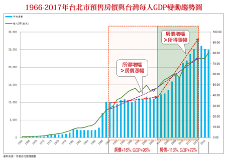其實,有關一成自備款問題,如果是在一九九○至二○○三年台北市每坪房價介於三十至四十萬元之景氣低迷期間,能夠藉由一成自備款及時拉年輕人一把,如今回想起來必然是一項德政無疑,因為其後自二○○三至二○一四年之間房價自每坪四十萬元一路飆漲至九十二萬元,足足上漲了一倍多。此外,如再就內政部營建署所公布一九九○至二○○四年貸款人民自購國民住宅十二萬三一三戶(詳請參閱表一)加以檢視,或許是時間巧合,正好與房市景氣相契合。惟如再就「貸款人民自購」係指由政府補貼利息,協助收入較低家庭購置民間住宅之意旨,應與這次徐部長所提出之協助購屋動機不謀而合,唯一差別在於利息補貼與降低自備款的不同方式。至於另一最嚴重的失誤則是時機不對,因為目前正好是二○一五年房市景氣下行之初始階段而招致強烈批評,其所以致此,當然是沒充分掌握市場資訊與實務現況。 由於二○○三至二○一四年房價逐漸飆漲,房價所得比與貸款負擔率亦隨之逐年攀升(詳請參閱表二、表三),按2018Q1全國房價所得比高達九.○八倍,六都為七.二九至十五倍,遠超過一般國際三至五倍之衡量標準,至於貸款負擔率全國三七.二五%,六都介於二九.九二~六一.五四%之間,亦高於國際三○%至三分之一的衡量標準。而此際最具爭議性的焦點問題,應是房價高漲,所得卻長期遲滯,導致政策一稍有閃失,就很容易引發民怨。由以上之分析,當前房市景氣依舊低迷,加以超額供給與投資客急於釋出,另一方面持有成本愈來愈高,此外,日本少子化與老年化之後遺症亦逐漸廣受國人關注,因此,現階段政策規劃仍應以延續營建署既有的租金補貼與優惠購屋貸款方案較為妥適,至於如何減輕年輕人購屋負擔,勢必得再等個三、五年市場景氣動向明朗之後才會比較具有實質意義。另外,如附圖一九六六至二○一七年台北市預售房價與台灣每人GDP變動趨勢圖所示,其中一九九○至二○○三年每坪房價由三三.六二萬元漲至三九.一○萬元,漲幅一六.二九%,每人GDP由八三二五美元增加至一四一二○美元,增幅六九.六一%,這一段期間不僅人人皆得以輕鬆購屋,資產還大幅增值,可謂皆大歡喜。