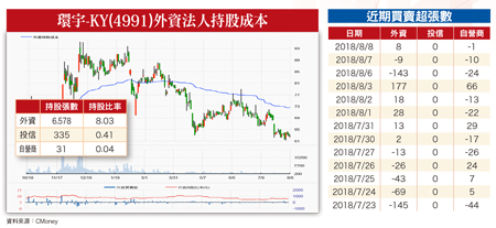 環宇-KY將迎接另一高速成長期例如,環宇-KY(4991),股價由去年高點修正至今逾七個月,為全球首要提供(III-V族)化合物半導體(砷化鎵、磷化銦、氮化鎵)純專業晶圓製造服務。所製造的組合產品包括用於無線通訊市場的射頻積體電路(RFIC)和毫米波積體電路、功率電子市場的功率元件、光纖通信的光電探測器和激光器。除了提供晶圓製造服務外,也開發生產及銷售自己的專有光晶圓和晶片("GCS Known Good Die"™),包括GaAs及InGaAs探測器晶片與探測器陣列晶片、雪崩光電二極管(APD)晶片,以及垂直腔表面發射激光器(VCSEL)晶片與晶片陣列,大部分屬客製化或寡占的品項,終端應用範圍如Data center、國防、衛星等高毛利利基型市場。二○一七年在考量公司產品線布局下,合併了D-Tech Optoelectronics,而二○一八年規畫籌建六吋廠,將擴大營運規模。車用產品將供不應求今年六月環宇-KY從廈門三安集成電路有限公司受讓廈門三安環宇集成電路有限公司二%的股權,環宇取得五一%的合資廠股權後,將具備主導能力,有利於加速製程導入之時程,確保產能以加速應用於五G及其他智慧手機相關先進製程商機之掌握,目前六吋合資廠月產能為八仟片,加計現有美國的四吋廠後,產能規模已追上宏捷科宏捷,而合資廠將專攻消費型電子產品,預期明年下半將有明顯貢獻。目前高頻複合材料GaN(氮化鎵)在車用產品上已供不應求,全球兩大供應商CREE、Sumitomo交貨期都已經拉長到數月,由於GaN符合高頻與高功率,因此5G基地台的建置GaN將是主流技術材料之一,環宇-KY過往在軍工產業已具備GaN量產經驗,二○一九年將可望受惠5G基礎建設商機,另外環宇也有BAW Filter零組件能力,為國內5G通訊元件技術領先者。環宇-KY第二季營收為五.二四億,年增率為一四.四%,在產品組合優化之下(光通訊比重提高而低毛利RF產品比重降低),毛利率上升至四九%,稅後獲利為○.九三億,EPS 為一.一三元,而下半年經歷中興事件後,自有產品比重將上升,法人預估二○一八年營收為二一.二六億,年增約一○.四%,全年EPS預估為四.九五元,目前本益比約十二.七倍,未來有調升空間。