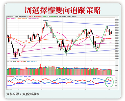 在川普左打加拿大右打歐盟後,全球貿易糾紛再次陷入僵局,更不用說對中國二千億商品的追加關稅已勢在必行。接著是流動性緊縮的問題,自美元轉強之後,新興市場便面臨資金撤離的問題,尤其是經常帳赤字比例偏高的經濟體,更因資金大量匯出而面臨債務違約的風險。為了緩解資金出走,新興市場各自加強緊縮政策,以期減緩資金流出速度。但在現任聯準會不疾不徐的升息節奏下,美元魅力絲毫沒有減退的跡象。而資金流出正是台股目前面臨的問題,使得現在台股推升動能不足,加上台股容易受國際消息面影響,今年以來,台股就在一○五○○點到一一一○○點區間來回震盪。接下來即將進入產業旺季,或許將有機會改變現狀,尤其這次市場看好Apple新機將掀起換機潮,一旦市場看好銷售預期,將有機會吸引資金投入台灣的智慧型手機供應鏈。配合技術面來分析,加權指數在一一○九三點受制於前高壓力出現高檔轉折後,便進入整理走勢。從DMI指標來看,目前+DI仍大於-DI代表盤勢由多頭掌控,但ADX目前持續向下,表示多方控盤力道持續減弱。接著看籌碼,外資在台指期的未平倉部位,淨多單維持在四萬七千多口水平,表示外資並未因指數修正而減碼。自營商在選擇權的未平倉部位,Buy Call為五千多口左右,Sell Put為三萬多口,代表自營商態度也相當樂觀。綜合技術與籌碼來看,技術面雖然呈現多頭力道轉弱,但籌碼仍積極布局多單,近期可利用溫漲(買權多頭價差)策略來追蹤。
