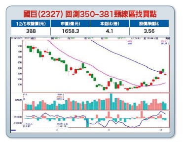 川習會釋利多,明(二○一九)年元月起暫緩加課關稅三個月,即美中貿易戰暫時休兵至明年三月底。台股亦完全按照我們事先的沙盤推演,本週一在利多推升下,短線將直攻一○一二七至一○二七二點壓力區。之後我仍傾向一○二七二至一○四二八點缺口這次上來不易補,所以短期加權指數可能會在季線上下至月線上下做震盪,等待十二月二十日美聯準會(Fed)利率會議結果,原則上若無意外應該是升息一碼,但重點是會後聲明至明年還能升幾次?甚至十二月就是最後一次?不過,就波段而言,到明年三月底為美中貿易戰空窗期,剛好吻合過去的歷史經驗,一九九七年、二○○○年、二○○七年、二○一一年、二○一五年的空頭市場裡,年底到隔年三月都會有一大波的跌深報復性行情。台股融資水位在相對低檔 融券在相對高檔理由如下:財報空窗期、年初做夢行情、高股息殖利率題材,以及最重要的融券強迫回補軋空行情,目前不僅融資水位在相對低檔,而上市櫃公司融券加起來大約七十萬張,仍在相對高檔,又再度注定台股走勢將如溫水煮青蛙一般慢慢軋空上去,明年農曆年前後台股應該有機會反彈到年線上下,之後再下來修正。俗話說得好,底部都是利空,而頭部都是利多。國巨(2327)前幾個月從一千三百元下來,天天都是營收創新高利多,只有我們領先市場善意提醒大家小心第四季淡季庫存調整利空。而當國巨十月營收較九月大幅衰退三八%的利空出來時,股價跌到二九二元,我們再度獨排眾議告知,從一千三百元跌到二九二元,其實已經把第四季至明年第一季淡季庫存的利空反映得快差不多了,如果以法人預估明年國巨可以每股賺四十至六十元,算下來本益比也只有六.五至八.五倍。加上今年前三季累計EPS為七二.二元,明年初具高配息題材。之前國巨因為美中貿易戰造成中國庫存偏高而受害,短期也將因貿易戰休兵而受惠,加上先前股價跌太深,一波報復性中期反彈應該不會只彈到季線而已,後續應有機會挑戰半年線至年線壓,如此上面空間還不小。