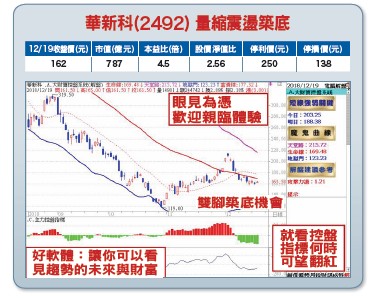 十二月十四日及十七日連兩天美股受美國嬌生公司因爽身粉含致癌物,導致股價暴跌,以及美國總統川普再度撂狠話,要求興建邊境牆的資金,否則將停擺美國政府,加上台北時間十二月二十日凌晨美聯準會Fed利率決策會議,美道瓊工業指數連兩天重挫大跌一千點。不過,反觀這兩天台股為何能夠展現相對抗跌走勢?原因很簡單,第一,嬌生事件及川普威脅美國政府恐將停擺等影響有限,再者,預期美聯準會升息一碼後,明年將可望暫緩升息的預期心理下,勢必牽動國際資金大搬風,美元貶,亞洲新興市場國家貨幣趨升,有利台股作價反彈。雖然台股欲再攻克萬點關卡,必須美股與外資買盤配合,不過,隨著美中貿易談判氣氛轉趨樂觀,中國大陸釋出善意回應,配合內資買盤加溫,年底法人與集團作帳行情如火如荼展開,只要國際股市沒有進一步不可預期之利空發生,預期近期台股將可望朝良性正面發展。內資當家,漲股不漲勢的行情,就是看中小型轉機成長股輪動表現,譬如指紋辨識系統神盾(6462),前三季合計EPS達九.九一元,累計前十一月營收達五六.二六億元,年增三四.一三%,財報優於預期,光學指紋辨識晶片預計明年第一季量產出貨,第二季起放量,客戶涵蓋韓廠與陸廠,價格為電容式指紋辨識晶片三至五倍,可望帶動營運及獲利大步成長,股價從十月二十六日八十九元觸底止穩契機浮現開始,至近期一路反彈來到二二八元,漲逾一.五倍。目前台股像這類具有題材、有未來及有成長型的中小型轉機股還很多,老師也會一檔一檔幫大家挑選出來。【個股推薦】華新科(2492)為全球前五大MLCC製造商,主要利基題材有:(1)獲利耀眼:第三季合併營收一八○.五億元,季增五八.五五%,創歷史新高,營業毛利一二七.七三億元,季增九八%,單季合併毛利率七○.七六%,稅後盈餘九一.六二億元,季增一.○九倍,創歷史新高,EPS十八.八五元,累計前三季合併營收三六○.七六億元,EPS三○.六九元。第四季為營運淡季,十一月營收降至四○.三一億元,月減一五.五三%,年增九二.二五%,在今年MLCC較去年大幅調漲下,公司自結十月稅後淨利率仍達四八.九五%,EPS達四.八三元,單月仍繳出近半個股本的獲利表現,估全年將有上看四.五個股本的機會。(2)長期前景展望持續看好:台系MLCC廠受大陸黃金周及中美貿易戰影響,第四季營運展望保守,不過,由於明年日商退出大宗貨MLCC供應,大宗商品缺貨情形會更明顯,預計明年第一季價格將可望觸底,第二季至第四季價格可望回升,長期產業趨勢持續向上。華新科表示,看好聯網汽車、5G及物聯網等應用將帶動中高階MLCC需求成長,目前被動元件設備交期仍長,且內建與外接式聯網車用需求持續增長,聯網車用級被動元件的供應持續吃緊,未來部分中高階品項MLCC缺貨將成為常態,至二○二○年都將供不應求。日系大廠村田製造所今年以來三度宣布擴產計畫。(3)美中貿易暫時休兵,營運可望否極泰來,加上慣性改變、低檔量縮震盪築底,一旦股價可再度站穩於十日線、月線及季線等短中期均線之上,完成雙腳築底型態,買盤將可望不請自來,截至十二月十八日,券資比仍高達三三.九一%,若無意外,預期後市可望有軋空大漲再戰二五○元關卡機會可期(※基本面資料若有異動,依公開資訊觀測站最新訊息為主)。【操作建議】低接不追高,隨著慣性改變、低檔量縮震盪築底以及券資比攀升,一旦「控盤指標」及「攻擊力道」可雙雙翻紅轉強,預期後市有軋空大漲的機會可期,基於風險考量,設好停損停利(詳見附圖說明)。