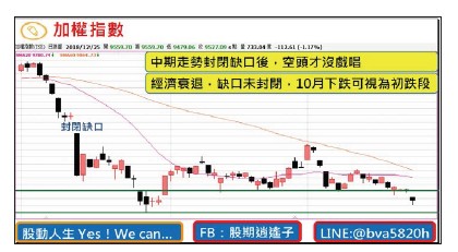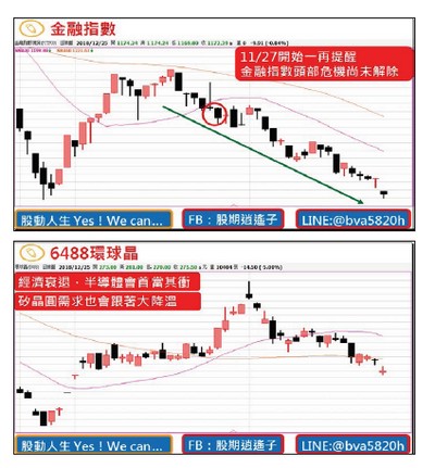 美國聯準會(FED)在十二月二十日公布其利率決策,聯準會主席鮑爾(Jerome Powell)不甩川普點名批評,和聯邦公開市場委員會(FOMC)所有成員無異議通過升息一碼,來到二.二五%至二.五%區間,同時計畫明年再升息二次,會後美股三大指數即開始一路下跌,至平安夜,跌幅高達六%以上。觀察這段時間的全球股市,歐美主要國家都已跌破今(二○一八)年十月的低點,亞股包括恆生、韓國綜合,以及加權指數,今年的低點卻都還沒跌破,加權指數為了年底作帳,硬撐在九六○○至一萬點,四百點的區間,絲毫不畏懼美股的重挫,這個慣性,在十二月二十五日終於撐不住了,跌破了九六○○這個區間,向下往另一個區間(九四○○至九六○○點)尋求支撐,在這個區間,多方操作得要謹慎小心了,將多方部位減碼,增加空方部位!回測9400那些類股要小心在連續多期周刊,我們都有提到兩大類股要提防,第一個是金融股,目前金融股遇到幾個利空─選舉結束,景氣衰退!選前護盤跡象明顯,選前金融指數領先大盤來到季線反壓,選後買盤力道不再,金融指數領先大盤回測今年低點。同時從中美貿易戰還有延長賽要打,加上油價的崩跌,我們在群組、影音、周刊即不斷提醒大家,明年經濟成長放緩,已有衰退疑慮存在,從大同集團子公司華映、綠能爆出財務危機向法院聲請重整開始,市場擔心經濟衰退,銀行貸放出去的金額,會不會變成呆帳收不回來?經濟衰退,金融股的成長動能在那?第二個是半導體類股,之前周刊曾經提到,當經濟衰退,民眾消費保守,非民生必需品的電子產品成長力道不再,半導體會首當其衝,根據國際半導體產業協會(SEMI)最新資料,十一月北美半導體設備商出貨金額十九.四億美元,連續六個月下滑,也是近兩年來,首次低於去年同期金額。經濟衰退情況下,明年全球晶圓廠設備投資,從成長七%轉為衰退八%,當這些半導體廠投資減少,轉趨保守時,矽晶圓需求也會跟著大降溫,價格走跌的壓力隨之而來,我們在群組或是影音也不斷提醒大家要避開矽晶圓,甚至建立矽晶圓空單!這兩大類股,短線上多方還是要小心!即將邁入二○一九年,投資朋友不妨趁著元旦四天連假,好好檢視一下今年的交易紀錄,尤其明年在中美貿易還有得打的情況下,波動仍然很大,檢討一下自己的操作策略,不管是賺錢部位還是賠錢部位,對的部分要把他放大,錯的部分要避免再犯,這些都會成為來年操作的養分。動盪的二○一九年,歡迎大家加入我們的群組,我們陪著你,二○一九年,新年快樂!