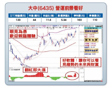 儘管今年全球景氣恐將面臨下滑風險,隨著美國聯準會升息策略改變,心態轉趨偏鴿,美中貿易談判氣氛轉趨樂觀,三月一日提高關稅大限可望延後,美股四大指數全面揚升,以及內外資力挺偏多不變前提下,這一波多頭反彈行情自一月四日九三一九點觸底反彈上漲以來至今,是否有因此而改變?很明顯並沒有,原因很簡單:第一,各位須知,今天造成全球及國內經濟成長力道趨緩最主要原因,來自於美國聯準會縮表升息及美中貿易戰開打的影響,隨著美國聯準會官員心態轉趨偏鴿、MSCI三升台股權重,以及美中貿易談判可望獲得重大突破與進展,對全球經濟來說,將可望注入一劑強心針。第二,外資回頭心態轉趨偏多,不僅元月份轉呈淨匯入金額達三○.一一億美元,外資累計淨匯入水位再度站上二千億美元,從豬年新春開紅盤以來,連二日現貨大舉加碼買超二二二.七五億元,台指期貨亦同步偏多,截至二月十二日,累計淨多單部位達五七九九二口,呈現中性偏多,加上內資法人大戶力挺偏多,OTC櫃買指數自去年十月二十九日一○九.一四點觸底反彈上漲以來至今,已反彈大漲逾二三.五%。特別值得一提的是,隨著多方心態偏多、作價企圖心欲罷不能,以及上市櫃公司股東會召開在即,三月份進入融券強制回補高峰期,在雙軋行情啟動下,不僅台積電、大立光等持續穩步盤堅上漲,矽晶圓、被動元件及風電概念股等弱勢股紛紛止穩強彈大漲、不再破底,包括軋空題材股以及中小型轉機股,也一檔接一檔強彈大漲,甚至亮燈漲停再創新高,當弱不再弱,且強又能續強,類股與個股之間維繫良性輪動輪漲格局,顯見後市行情仍不容小覷!在多頭格局不變前提下,後市行情仍是震盪看漲,尤其以OTC為主之中小型轉機股及高券資比軋空題材股等,仍將持續扮演多方攻堅要角。展望後市,隨著多頭反彈個股輪動精彩好戲持續進行中,想要把握下一檔嘉晶或台表科輪動飆漲機會的投資朋友,歡迎加入飆股鑫天地LINE@的優質團隊,讓您可以看見財富的未來,飆股鑫天地LINE@-ID:@gold99(@不可省略),有任何持股問題,也歡迎來電洽詢,倫元投顧諮詢專線:(02)2321-9933。【個股推薦】大中(6435)主要法人股東為茂達,持股約六五%,主要產品為功率元件(MOSFET&IGBT)、高壓積體電路(HV IC)設計。主要利基題材有:(1)業績亮眼:去年前三季每股繳出七.四元好成績,已大大超越二○一七年全年四.七三元水準,且受惠MOSFET出貨暢旺、產品報價調漲,估二○一八年全年將有挑戰一個股本的實力。元月營收達二.三二億元,月增約一成,為近四個月新高。(2)MOSFET再掀缺貨潮:受惠AI、5G、物聯網及車用電子等新應用崛起,今年可望進入快速成長期,對於金屬氧化物半導體場效電晶體(MOSFET)及絕緣柵雙極電晶體(IGBT)需求殷切,國際IDM大廠已經喊出上半年MOSFET、IGBT交期將再度延長,並上調報價,包括英飛凌、安森美在低壓及高壓MOSFET目前交貨時間已延長至三十九至五十二周,意法半導體最長也需要四十二周才能交貨,國內MOSFET廠交期也達二十周左右,加上英特爾CPU缺貨紓解、超微及輝達新款電競繪圖卡出貨暢旺,同步帶動MOSFET需求回升,首季營運將淡季不淡,隨著交期不斷拉長、轉單效應及報價調漲,後市成長爆發力仍將相當強勁。【操作建議】低接不追高,營運及產業前景持續看好、內外資法人力挺偏多,多方架構不變,只要「控盤指標」及「攻擊力道」可續維持翻紅強勢攻堅,成交量可順勢加溫,後市仍將可望有大漲再創新高機會可期(※基本面資料若有異動,依公開資訊觀測站最新訊息為主)。設好停損停利(詳見附圖說明)。