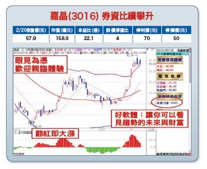 一月四日當指數跌破九四○○點關卡,許多專家紛紛看壞後市、看空行情,甚至叫您把股票賣在不該賣的地方時,當時九三一九點我看多,我看千點行情,很多人都覺得我「瘋了」,結果現在大家事後回過頭來看,至二月二十日再創一○二七二點新高為止,已足足強彈大漲九五三點。隨著美中第七回合貿易談判於二月二十一日至二十二日在華府登場之際,川普再度暗示可能考慮延長休兵期限,一般預料再延長六十天協商期機率甚大,在雙方均有一定共識與認知之下,對於美股與全球股市也將有推波助瀾的效果。就類股與個股的輪動架構來看,光學鏡頭、電子材料、機器人概念股及生技股等持續強勢上攻,矽智財、機殼廠、軟板及自行車等也接續輪動強彈,顯見法人大戶作價企圖心沒有改變,在多方氣盛、市場人氣回籠以及多頭反彈趨勢不變的前提下,逢低偏多操作的策略就無須改變。對於部分漲幅已大個股不建議過度追價,不過,隨著個股輪動輪漲精彩好戲持續進行中,對於一些股價還在相對低檔,且前景展望佳的族群與個股,逢低仍值得留意。【個股推薦】嘉晶(3016)磊晶產量為世界第二大。主要利基題材有:(1)業績表現亮眼:二○一八年前三季EPS達一.二元,較前年同期大幅成長近二倍,去年全年營收達四五.二四億元,年增三五.三三%,優於市場預期。受惠MOSFET及IGBT等功率元件強勁需求、市場供不應求、報價調漲、國際IDM大廠擴大委外代工,以及因應電動車及自駕車、5G高速通訊、人工智慧及高效能運算(AI/HPC)等新應用快速崛起,包括英飛凌(Infineon)、安森美(ON Semi)、德儀等提前卡位第三代半導體關鍵材料碳化矽(SiC)與氮化鎵(GaN)市場,嘉晶已投入GaN及SiC的矽晶圓及晶圓代工技術多年,掌握致勝先機,今年營運持續爆發大成長可期。(2)為國內唯一同時提供碳化矽、氮化鎵兩種磊晶製程廠商:碳化矽於「一千二百伏特以上」的高壓背景環境,具十分顯著的應用優勢,並可大大減少高達「八五%」的切換能源損失,非常適合運用於電動車、高鐵、超高壓直流輸送電、工業電機、智能電網、航空航太等高壓電力(高功率)應用領域。氮化鎵則主要應用於「六百至一千伏特」工作電壓區間,對應SiC、GaN基材材料特性發展出的功率半導體晶片,如:MOSFET(金屬氧化物半導體場效電晶體)、IGBT(絕緣柵雙極電晶體)等,於產業界、市場發展功率半導體應用時,亦將超越以往因矽基材性能較低造成的應用限制。因SiC、GaN基材具備更佳:低電流阻抗(膜厚漂移層drift diffusion更可薄化,進一步降低電流阻抗值)、高電能轉換效率、耐高溫及低過熱風險(因為寬能隙)、耐高壓(因擊穿電場高)等運作優勢,結合動力模組的體積、重量同步縮減,有利電動車進一步延長「單次充電後行駛距離」,亦間接有助於全球電動車市規模持續擴大,因此,誰能夠掌握到碳化矽與氮化鎵關鍵技術,將可望帶動未來營運及獲利大爆發。(3)營運前景看俏:根據券商報告表示,預估未來五年碳化矽與氮化鎵功率元件與模組的年複合成長率為二一%、八三%,嘉晶除了四吋SiC碳化矽、六吋氮化鎵已正式出貨,今年將更進一步導入六吋碳化矽磊晶製程。【操作建議】低接不追高,法人力挺偏多,以及雙軋行情啟動(截至二月十九日,融券餘額達五六四四張,券資比達五八.八八%),雖股價已累積一段不小的漲幅,後市只要守穩月線或季線不破,加上「控盤指標」及「攻擊力道」可續維持翻紅強勢攻堅,後市仍有軋空大漲再創新高機會可期(※基本面資料若有異動,依公開資訊觀測站最新訊息為主)。基於風險考量,設好停損停利(詳見附圖說明)。