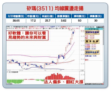 隨著美中貿易爭端可望有解,再到美國聯準會領導各國央行心態由鷹轉鴿,在信心面和資金面加持下,全球股市籠罩在一股樂觀氣氛,台股也一如預期一路驚驚漲,突破於年線位置區之上,不過,這股多頭氣勢是否可延續下去?除了全球經濟基本面能不能跟上來為一大關鍵,再者,由於一○七○○至一一二七○點間長達近九個月的大套牢區賣壓,在景氣未止穩回升情況下,欲有效突破確實有其難度。一、從製造業採購經理人指數(PMI)來觀察,目前先進國家除美國之外,歐盟及日本均跌破五十榮枯線,中國持續低於五十,顯見全球經濟成長力道仍相對疲弱。二、根據中經院數據統計,台灣二月經季節調整後之製造業採購經理人指數(PMI)為四八.三%,雖小幅反彈,仍連續四個月呈現緊縮,未來六個月景氣狀況指數為四二.九%,較前次數據增加八個百分點,仍連續六個月呈現緊縮。二月份非製造業採購經理人指數(NMI)為四七.八%持續下滑,且第二個月緊縮,未來六個月景氣狀況指數為四五.八%,即使較前一個數據彈升九.一個百分點,仍連續八個月呈現緊縮。因此,在全球經濟面尚未能止穩復甦上來之前,目前最佳策略就是持續反覆震盪,然後由具轉機成長題材之中小型股續維持良性輪動輪漲格局,待東風到來、時機成熟之後,再一舉放量往上攻,若能夠如此當然是最好。不過,也不必過度緊張,只要多頭架構未見改變之前,基本上逢低偏多操作,重點仍是在個股。【個股推薦】矽瑪(3511)是台灣唯一有能力生產手機防水耳機連接器的少數公司。主要利基題材有:(一)財報表現亮眼,獲利轉虧為盈:近年搶攻Fitbit穿戴裝置、車用、醫療及工業用等領域,成果開始顯現,受惠穿戴式裝置放量出貨帶動,終止連十一季虧損陰霾,二○一八年轉虧為盈,全年每股賺一.三一元。累計今年前二個月營收一.八三億元,年增二九.六六%,公司自結前二月稅後盈餘為二千四百萬元,每股盈餘○.五三元,優於預期。(二)三大利基加持,帶動營運成長:穿戴式裝置持續放量出貨帶動,後市營運轉機成長爆發力仍將相當強勁。目前穿戴式產品仍佔公司營收約五○%,主要客戶是Fitbit,車用、醫療及工業等約佔營收一○%至一五%,在新產品中已看到成果:(1)為美國軟體服務商開發的卡車安裝電子紀錄裝置(ELD),讓卡車企業主可透過ELD紀錄駕駛人的行為模式,作為後續追蹤或保險參考,美國去年底強制立法規範上路後,一台卡車至少需要裝設一組ELD,由於ELD單價及毛利率遠高於一般連接器,ELD出貨放量,可望為矽瑪增添成長動能。(2)除ELD外,矽瑪亦切入乘用車的OBD2(車載診斷系統)市場,矽瑪是供應美國Tier 1廠,因有特殊專利設計,可節省傳統人力密集問題,未來在車種滲透率可望逐步提升。(3)至於Nvidia及亞馬遜,矽瑪主要是提供Nvidia新款GPU板上連接器,亞馬遜則是以供應智慧家庭系列產品的外部連接器及線材為主。根據市調機構Gartner數據顯示,智慧手錶二○一八年全球出貨上看五千三百萬支,年增二七.七%,估今年上看七四○九萬支,年增逼近四成,市場規模高達一六二億美元,耳戴裝置出貨量將在二○二○年之後大躍進,都將帶動今年全球穿戴式裝置出貨量達到二.二五億台,年增達二五.八%。【操作建議】股價已大漲一大波,短線暫不宜追高,不過,在營運持續看好,以及業內法人大戶力挺偏多不變,只要守穩月線或三十元整數關卡不破,且隨著「控盤指標」及「攻擊力道」亦能夠雙雙維持翻紅轉強態勢,後市仍可望有一波強彈機會可期。設好停損停利(※基本面資料若有異動,依公開資訊觀測站最新訊息為主,操作見附圖說明)。