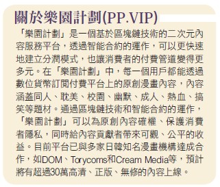 依據Gartner調查指出,目前七○%的零售商業組織都已計畫推出訂閱服務,從早期已轉型至付費訂閱制的數位媒體如《華盛頓郵報》、《洛杉磯時報》與《紐約時報》等,到近日美國蘋果公司(Apple Inc.)的春季發表會上,也宣布推出Apple News+搶佔商機。面對全新的「訂閱經濟戰場」,顯示付費訂閱服務已是未來趨勢,但如何降低讀者對於付費的意願門檻,同時又能將收益回饋給創作者,將資訊流轉換為金流,建立一套完善的「內容付費生態系」是有待改進的部分。「PP.VIP樂園計劃」因應興起並運用「區塊鏈」與「智能合約」技術打造的新創項目「樂園計劃」解決痛點,打造「消費者X原創者X貢獻者」三贏局面,即日起至四月十五日止於ACE法幣-數位貨幣交易所(ACE Exchange)、富加F.plus、CoinBay和HPX將作為「樂園計劃」內容平台終身會員PP.VIP代幣的首發平台開始第一波獨家優惠發售。此外,首批會員將有機會零費用(包機酒)參加「樂園計劃」今年五月在日本舉辦的「FANZA ADULT AWARS 2019」女優見面會。即將於五月底上線的新創項目「樂園計劃」,是一個基於區塊鏈技術的二次元內容服務平台,取代傳統的「付費牆」模式,透過智能合約的運作,可以更快速地建立分潤模式,也讓消費者的付費管道變得更多元。在「樂園計劃」中,每一個用戶都能透過數位貨幣訂閱付費平台上的原創漫畫內容,內容涵蓋了同人、耽美、校園、幽默、成人、熱血、搞笑等題材,除了通過區塊鏈技術和智能合約的運作,「PP.VIP樂園計劃」可為原創內容確保權益、保護消費者隱私,同時給內容貢獻者帶來可觀、公平的收益。目前平台已與多家日韓知名漫畫機構達成合作,如DOM、Torycoms和Cream Media等,預計將有超過三十萬高清、正版、無修的內容上線。
