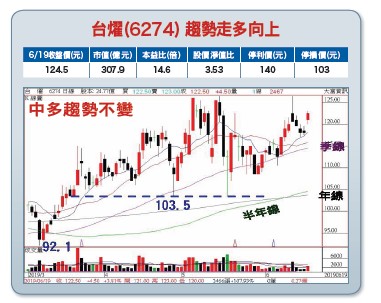 過去這一段時間以來,儘管市場利空不斷,以及美中貿易戰與華為禁令等衝擊,國際半導體公司博通(Broadcom Corporation)及晶圓代工廠台積電(2330)等營運遭受史無前例的打擊,也讓投資者人人自危。不過,在全球央行心態轉趨積極偏鴿、蘋果新一代iPhone手機進入備料拉貨期、各國5G加速商轉相關零組件拉貨潮啟動,以及下半年傳統旺季來臨,在飆股鑫天地LINE@群組裡,老師就跟大家說過:為什麼台股殺不下去?甚至道瓊、Nasdaq及標準普爾500等指數從六月三日觸底反彈上漲以來,表現可以這麼強,離前波歷年高點僅近在咫尺?果然六月十八日在川習熱線敲定月底日本G20川習會即將登場下,不僅費半樂翻天,隨即大漲四.三三%,道瓊漲逾三五○點直逼前高,甚至包括台股亦同步大漲並順利突破站穩於季線之上。展望未來,除非川習會不歡而散,川普持續加大力道擴大對中國輸美商品的加稅措施,與其他不可預期的重大利空產生,否則預期中美雙方可望重返談判桌,後市行情將可望有持續向上的機會,甚至隨著除權息行情啟動,一些高券資比題材個股亦將有軋空續漲的機會。既然行情可望重回多頭軌道,短線若有震盪,都將是逢低擇股布局的好機會。【個股推薦】台燿(6274)為國內四大銅箔基板廠之一,主要利基題材有:(1)躍居銅箔基板獲利王:搭上伺服器及網路獨特成長商機,在電子業成長性普遍下滑環境中,顯得更為耀眼,二○一八年EPS繳出七.四六元好成績,營收、獲利、每股盈餘等皆創新高,較二○一七年大幅成長逾八一%,優於市場預期,躍居銅箔基板每股獲利王。(2)第二季及下半年營運看旺:受季節性淡季影響,第一季營收三八.八二億元,略遜於去年同期,稅後淨利三.八億元,每股盈餘一.五四元,仍創下歷史同期次高,五月營收十五.二億元,月增○.六%,年減○.五六%,近八個月新高,累計前五月營收六九.一億元,創歷年同期次高。隨著網路速度的提升以及技術的突破,許多新興應用與服務逐漸顯現,包括超高畫質影音串流、物聯網相關應用、人工智慧與大數據分析、雲端運算儲存、AR/VR等,隨著全球數據流量的高速成長,帶動網路服務營運商及電信商必須更新設備滿足市場需求。以台燿來說,公司應用在資料中心所用的400G交換器T3+以及伺服器相關產品,可望升級至Very Low Loss並啟動,加上陸續通過客戶端認證,考量高階產品有能力的供應商少,隨著客戶庫存調整告一段落,需求有望回溫,以及新竹和大陸常熟廠等新產能可望於第三季進行量產,後市營運逐季成長可期,中長期營運維持成長看法不變。(3)外資調升評等及獲利預估值:看好5G即將步入商轉倒數,在各大廠基礎建設與終端設備積極開發布局下,且客戶青睞台燿產品的性價比優勢,黏著度高,繼去年EPS創歷年來新高後,外資預估今、明兩年將可望再年增八%與三六%,甚至二○二○年估EPS上看十一.五二元。【操作建議】低接不追高,在美中貿易戰風險尚未完全解除,多少影響買盤追價意願,不過,配合趨勢走多不變,內外資法人心態偏多,只要守穩年線關卡不破,短線若有拉回亦可留意,預期後市仍有續漲機會(※基本面資料若有異動,依公開資訊觀測站最新訊息為主)。基於風險考量,設好停損停利(詳見附圖說明)。