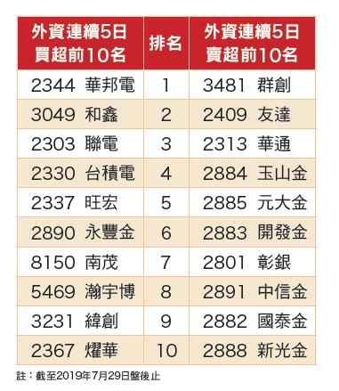 Q台股大盤近日來又陷入膠著行情,來到萬一關卡壓力不小,加上量能一直不出,上攻難度增加,這次美國降息在即,降息後的熱錢是否會湧入台股,一鼓作氣突破萬一,股民充滿期待,降息前外資做了哪些部位調整?未來該買哪些股票呢?A:大盤近日挑戰萬一關卡未過,拉回整理中,自從五月六日大跌以來,台股花了兩個月時間再次回到大跌的起跌點,然而此區壓力甚大,投資人追高意願不濃,台股遲遲無法放量上攻,美國降息在即,如果聯準會順利達成降息共識,熱錢將有機會湧入台灣股市。近日來類股輪動,外資關注焦點已經從原本的金融類股轉到電子類股,特別是已經除權息完畢的金融股(像是玉山金、元大金、中信金、新光金……等),外資連續多日賣超,不打算參與填息,這也表示金融股未來上漲空間有限。觀察近日外資連買動向發現,產業龍頭或法說會有成長空間的股票成為外資選股最愛,如附表華邦電法說會表示七月產能全滿,並表示在日韓相爭中看到機會,而台積電是晶圓代工龍頭股,一直都受到法人青睞,整體來說,大盤類股輪動回到電子類股上。台股高檔震盪,在金融及電子類股不同步情況下,股票續航力不足,操作上以選股不選市、短進短出為原則,目前降息熱錢效應在台股表現上並不明顯,端看周四凌晨發表談話內容而定,如果這次的降息是屬於一次性預防性降息,對於台股未來影響不大,但若是循環性降息,全球熱錢才有機會湧入台灣市場,為股市帶來後續量能。綜合上述背景,建議投資人先保守觀望,等待量能確認後再布局會安全一些。