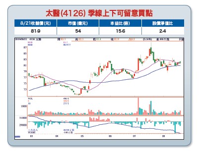 自八月二日川普宣布對中三千億美元產品加課關稅至今,波段的走勢大致上都和我們事先規劃差不多,包括八月二日當天告知短線將回測前低一○二二七上下,八月六日來到一○一八○時告知短線要反彈,然後再做探底打底完,就準備展開一波較大幅度的反彈行情。故對後市看法仍不變,半年報利空已出盡,九月一日關稅生效也是短線利空出盡,加上九月十日前要公布八月營收(電子旺季大都優於七月營收),以及市場預期九月十八日Fed可能再降息一碼情況下,台股應有機會反彈一波來挑戰季線一○六○○至一○六五○上下。除非這波反彈能夠上來回補八月二日的空方缺口一○六四一至一○七一四,指數才有機會再挑戰一一○○○上下。若缺口無法上來回補,則反彈完必破一○一八○點。至於九月十八日Fed可能再降息一碼,若沒降,短線失望性賣壓出籠,若降一碼則也是利多出盡。重點是七月底降一次一碼,市場和Fed還可說是買保險預防性降息,若九月十八日降息,甚至十二月中再降息,那就不是所謂買保險預防性降息,而是Fed已默默幫市場背書,美國景氣準備開始步入衰退了。這陣子資金大多數已往債市跑,而不是股市。所以當九月蘋果新機發表前後至Fed利率決策會議前後,最慢撐到十月初,將因美國第四季總經可能向下,加上大多數電子股準備開始步入淡季,屆時需特別小心另一波段回檔修正,之後才會展開所謂的總統大選行情。個股操作部分,大多數電子這裡只剩短線末段行情,就如同去年六至七月的被動元件和矽晶圓一樣,利用旺季營收獲利的利多邊拉邊出。所以從現在到九月中下旬,大多數電子股上去是找賣點,九月中旬至第四季因準備進入淡季,小心多殺多一波下去。績優生技股雖非現階段人氣焦點股,但較不受景氣波動影響,且下半年和明年獲利仍有機會較今年成長,波段角度而言將相對安全下,明年具高配息題材。太醫(4126)以自有品牌PAHSCO與代工並進發展,主力產品包含密閉式抽痰管約占營收四八%,袋類占一○%,傷口引流組一二%,其他產品如瓶類等占約三成。上半年EPS二.二九元,年增九一%。由於下半年進入傳統業績較旺季節,預估第三季營收仍會維持正成長,全年營收將突破二十億元,本業EPS上看四.五元。日前已公告出售位於苗栗縣銅鑼鄉民生路14號、16號之土地及建物給裕利工,預估稅前處分利益約為一.八九億元,以股本六.六億元,扣除所得稅後,每股貢獻度約二.二元,預計最快可在第四季入帳。若加上業外出售土地利益,不排除今年EPS有上看六.七元上下能力。