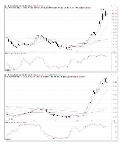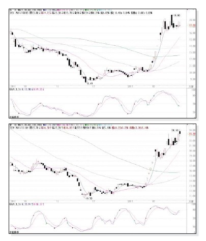 解說:(1)我們來看友輝的日線圖,其最後一波下跌的高點在2011/12/12的58.8,於52.4~59這一段上漲突破末跌高58.8出現翻空為多的訊號。(2)之後回測ma20與52.4~59這一段的中勢拉回在55.7附近作止跌,於2012/01/10出現KD指標黃金交叉的訊號,此為上述葛蘭碧第三買點。(3)這一天剛好也是三均糾結的突破訊號,其收盤在58.7到圖中高點117.5其間利潤高達二○○%,這段上漲共花了二十四天。其後KD指標一直維持在80~100的軋空位階。解說:(1)我們來看至興的日線圖,其最後一波下跌的高點在2011/12/12的38.6,於37.4~39這一段上漲突破末跌高38.6出現翻空為多的訊號。(2)之後回測ma20於2012/01/10出現KD指標黃金交叉的訊號,此為上述葛蘭碧第三買點。(3)這一天剛好也是三均糾結的突破訊號,其收盤在38.1到圖中高點55.8其間利潤高達四六%,這段上漲共花了二十一天。解說:(1)我們來看長天的日線圖,其最後一波下跌的高點在2011/11/17的11.7,於8.49~11這一段上漲為強勢反彈走勢。(2)之後回測ma20與8.49~11這一段的中勢拉回在9.74附近作止跌,於2012/01/31出現KD指標黃金交叉的訊號,此為上述葛蘭碧第三買點。(3)這一天剛好也是三均糾結的突破訊號,其收盤在10.45到圖中高點18.8其間利潤高達八○%,這段上漲共花了十四天。解說:(1)我們來看泰谷的日線圖,其於10.7~13.6反彈a-b-c。之後回測ma20與10.7~13.6這一段的中勢拉回在12.15之上作止跌,於2012/01/17出現KD指標黃金交叉的訊號,此為上述葛蘭碧第二買點。(2)這一天剛好也是三均糾結的突破耦合效應訊號,其收盤在13.6到圖中高點24.1其間利潤高達七七%,這段上漲共花了二十一天。其後日KD指標在軋空位階80~100上下擺盪,因此這波上漲利潤非常可觀。