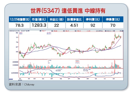 某股是台積電子公司(持股28.32%),也是台灣主要的八吋晶圓代工廠(共有三座),主要代工產品為LCD驅動IC、電源管理IC及指紋辨識IC。今(二○一九)年一月公司宣布收購格羅方德新加坡的Fab 3E八吋晶圓廠,交易完成後,每年將增加超過四十萬片的八吋晶圓產能,由於八吋晶圓廠產能最近被大搶購,明年新產能加入後可望拉高成長動能。某股為世界(5347)受惠5G需求興起,5G智慧型手機帶來的效益第四季起開始逐步發酵,亞洲八吋晶圓產能已逼近滿載,舉凡與手機相關的電源管理IC(PMIC)、CMOS影像感測器(CIS)、驅動IC等投片量都大增,不僅快速拉高八吋晶圓代工需求,訂單能見度也已經看到明年第一季。此外,明年有四大關鍵需求拉動,包括超薄型屏下指紋辨識、5G手機、PMIC/CIS升級,以及中國加速「去美化」,將使得晶圓產能供不應求。雖然世界5G訂單尚未完全發酵,不過在驅動IC需求淡季不淡效益下,表現也將優於往年水準,加上二○二○年有收購新加坡的新產能加入,可望承接陸廠去美國化的訂單需求,隨著台積電供應缺口不斷擴大,預期八吋晶圓產能趨緊不會迅速解除,明年成長力道值得期待。【操作建議】十一月二十六日一根帶量中紅棒站上七十元,宣告七十元以下為期一年的築底結構正式完成,從等幅漲勢計算,股價有機會突破歷史高點八三.六元,有向上挑戰九十元以上實力。