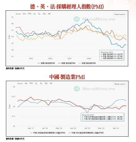 以原油供給面觀察,按照最新資料,二○一九年十一月伊朗原油供給已降至約二一○萬桶/日,主要供應中國與部分中東國家,除非衝突事件擴大,否則中東原油供給出現缺口的機率不高。加上美國頁岩油目前日產量已超過一二○○萬桶,具有一定程度的壓抑性。此外,全球經濟成長減速也阻礙了石油需求的成長。若以美國紐約輕原油期貨價格為基準,目前油價的量化觀察點約在六六美元/桶。若未來原油價格突破六六美元,則整年度全球的通膨壓力將如影隨形,可能嚴重制約全球主要央行執行貨幣寬鬆的力道,不利於股市。若油價回落至六十美元/桶以下,則通膨壓力不大,有利於全球主要央行的寬鬆政策;如果油價停留在六十~六六美元區間的時間拉長,則需視各國本身情況再作個別研判。各位也別忘了美國曾用過的手段,就是必要時宣布釋放戰略庫存來打壓油價。十二月製造業PMI 歐美轉弱亞洲轉強目前除了資金面持續有利於股市發展以外,若論續航力還得觀察基本面的變化。日前全球主要經濟體皆陸續公布了製造業採購經理人指數(PMI);美國方面,十二月美國製造業PMI由十一月的四八.一%降至四七.二%,遠低於市場預期的四九%,創下二○○九年六月以來最低。