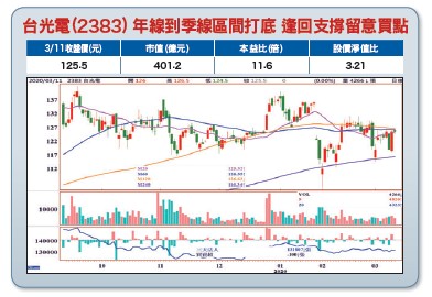 新冠肺炎疫情持續延燒,從中國、南韓到近日擴散到歐美,義大利宣布全國封城,市場極度恐慌、信心崩潰,台股三月九日被外資大賣五四五億而重挫三四四點跌破年線支撐,並爆出二三○九億成交量。雖然這次新冠肺炎疫情比十七年前SARS更加嚴重,市場擔心疫情持續延燒,恐造成終端市場需求下滑,進而拖累今年企業獲利以及經濟成長率。不過這應該是短期受疫情衝擊經濟活動急縮,造成需求遞延的假性需求下滑現象。因為只要疫情控制下來,經濟活動逐步恢復正常,終端需求就會明顯彈升,甚至是V型彈升上去。受疫情影響雖然第一季甚至第二季上半GDP將會下滑,但台灣因疫情相對穩定且製造端陸廠陸續復工中,所以整體而言第一季應是最差,第二季不會比第一季差,何況新冠肺炎病毒在夏天活動性會變差,除非到下半年疫情仍無解。故若因疫情造成上半年需求下來、企業獲利及GDP基期變低,只要疫情控制,那下半年甚至明年上半年不是相對今年上半年明顯成長嗎?若可預期整體未來一年最差可能就是現在至第二季上半,那股市不就處在相對低檔嗎?這就是為何疫情衝擊是短空中長多的主要原因,近期很可能是未來至少一年以上的相對低檔。故針對台股後市看法不變,短線而言,根據一月三十日爆出二七六二億量加上融資大減,兩天後在二月三日見一一一三八低點之後急彈到一一八五四點。二月二十七日爆出二○二○億量加上融資大減,三月二日隔周一見一一○四九低點之後急彈到一一五二五點。所以當三月九日又爆出二三○九億,若融資再大減,會不會又有機會三天內見低點急彈?波段而言,歐美疫情持續攀升衝擊市場信心,不過我們因疫情相對穩定且製造端陸廠陸續復工中,加上台股平均殖利率高達四%以上,所以跌幅相對歐美股市甚至日韓股市小,年線上下利空淬煉底部。不過解鈴還須繫鈴人,何時觸底打底完畢波段上攻先挑戰季線後再回補一一九三三至一二一○一空方缺口?關鍵還是要看疫情何時見高峰下來,不過可喜的是先失控的中國和南韓近期新增確診人數已有陸續明顯下滑跡象,如此預估約二至三周歐美可望見疫情高峰後逐步降溫。台光電(2383)在無鹵素基材、高密度連結(HDI)PCB用基材、智慧型手機用基材為全球市占第一,去年受惠於網通基礎建設、汽車板等高階新產品出貨,產能保持滿載,加上美系新機銷售優於預期,推升全年營收再創歷史新高。去年前三季每股賺六.五九元,全年估八.五至九元左右,可望配息四.五至五元。近期受疫情影響中國大陸湖北黃石廠雖仍未復工,但占營收比重不到五%影響有限,累計今年一至二月營收年增高達一五%。今年蘋果將推5G手機,主板用量增加、規格升級、售價提升,台光電作為銅箔基板獨家供應商將從中受惠,同時也打入三星與華為5G手機供應鏈,今年可望賺進一個股本,營運再創高峰。