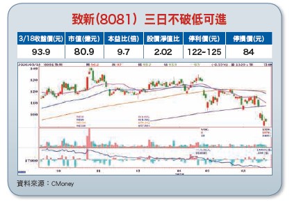 某股是類比IC廠,主要產品有電源管理IC(佔80%)、音頻運算放大器IC(佔16%)、溫度偵測IC(佔4%),受惠東奧即將到來,4K8K高畫質及大尺寸TV滲透率提升,電源管理IC平均售價提升,此外,來自面板電源管理IC市佔率的提升,以及因Type C滲透率拉高所帶來NB內PMIC用量提升效應,加上中國品牌廠對IC產品採購逐漸去美化,更有利致新在電視和面板等產品的出貨,預期今年致新營運仍可保持穩定成長。某股為致新(8081)德州儀器(TI)宣布自二○二○年底前取消IC通路商大聯大、文曄的代理權消息,ODM廠為確保未來零組件供貨無虞,已啟動「去TI化」。德儀是整合元件(IDM)廠,集製造、封裝測試於一身,交期原本就比較長,而國內類比IC廠的技術實力僅次於歐美,遠勝於中國,產品效能也不輸德儀,交期短、價格便宜的台廠就具備了替代效應。目前ODM廠已經選定茂達、矽力-KY及致新等IC設計公司,分別就脈衝寬度調變(PWM)、電源管理IC、線性穩壓器,甚至包括過去難以取得訂單的電源開關(Switch)進入產品驗證,最快將在上半年量產出貨,成長潛力值得期待。【操作建議】股價自一月十六日一三四.五元開始拉回,第一波於二月三日一○三.五元落低,反彈至二月十九日一二二.五元後進行第二波下跌修正,不管第二波修正低點在哪,如果股價能夠重回一○三.五元並且站穩不再跌破,則中期修正即可暫告一段落。