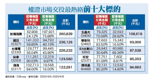 COVID-19持續在美國蔓延,四月公布的ISM指數仍維持在五十榮枯線之上,但四月三日美國勞工部公布三月份非農就業人數驟減七○.一萬人,結束美國連續一一三個月史上最長就業增長週期。就業人數月度降幅為二○○九年三月以來最大,以休閒與旅館業就業人數減少最多,達四五.九萬,健康照護與社會援助就業減少六.一萬人居次,且幾乎各行業就業人數都出現減少現象。失業率則由三.五%升至四.四%,為一九七五年一月以來最大單月增幅。三月份非農就業報告調查時間落在三月八日至十二日,但三月十九日加州州政府率先宣布全州實施居家檢疫,說明該數據並未反映三月最後二周因新冠肺炎疫情導致大量的失業人口。三月二十一日、二十八日當周初領失業金人數分別為三三○.七萬、六六四.八萬。如果經濟繼續停擺,四月非農就業報告很可能出現史上最大單月跌幅,市場預估將減少一千至二千萬人,失業率可能超過一○%。雖然就業數據來到歷史最糟糕的水準,但市場認為疫情最高峰已經出現,指數跌幅都陸續收斂,加權指數也在清明長假後站回月線。大立光(3008)四月九日舉行法人說明會,且三月營收維持成長,權證交投維持熱絡。