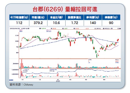某股是國內第二大軟板供應商(蘋果占八成營收比重),也是首家量產MPI(異質PI)產品的軟板廠商,由於5G手機天線材料將使用到MPI,且台郡的5G布局是從天線設計、模擬、製造,到模組測試,提供客戶一元化完整的服務,具備領先業界的競爭優勢。某股為台郡(6269)因供應鏈全面復工拉貨,台郡三月營收回升到二一.四五億元(月增87.8%、年增46.5%),優於預期。展望未來,雖然新冠肺炎疫情爆發導致客戶需求遞延,但整體訂單並未消失,公司除了持續深耕原有的FPC(軟板)和FPCA(軟板組件)外,亦持續致力在新材料與新技術發展,除了產品應用將由手機擴展至平板電腦及穿戴式裝置外,MPI天線模組貢獻看增,LCP天線模組在下半年也將貢獻營收。從產業趨勢觀察,未來成長動能將是高頻、5G的應用及導入,此外,大數據所需雲端處理的伺服器、光通訊產品、醫療照護及健康運動產業對軟板需求亦將持續成長,台郡將持續投入在高頻、車用電子、健康醫療、光通訊等相關領域,建立公司長期發展的競爭優勢。【操作建議】股價在百元關卡來回震盪,雖然股價尚未穩定,但成交量相對安定,顯示籌碼經過沉澱後已不再浮動,若能站穩一一○元整數關卡,則中多架構可望成形。