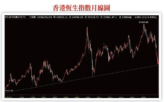 所以,恆生指數必然因為失去亞洲金融中心的特殊地位與街頭抗議事件頻傳的利空衝擊而下跌,在未來的十八至二十四個月處在探底的過程,從波浪理論的角度,不排除下探一萬七千點附近的超長期上升趨勢線。