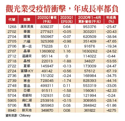 以飯店類股的股王晶華酒店,雖然第一季仍保有每股稅後純益為正的一.一六元,但今年一至四月的營收為十六.三億元,仍不敵大環境的衝擊,較去年同期衰退二四.五二%。