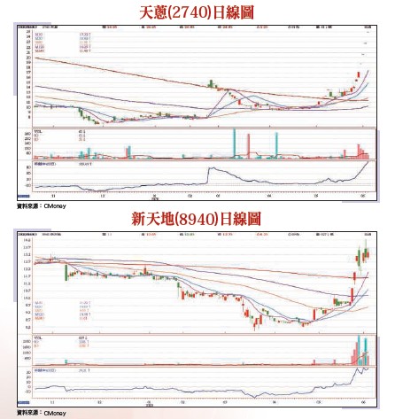 而股價反彈急先鋒,已悄悄創下今年新高價的「防疫新生活受惠族群股」還有天蔥(2740)、山富(2743)、豆府(2752)、老爺知(5704)、新天地(8940)、易飛網(2734)、富驛-KY(2724)、夏都(2722)等。