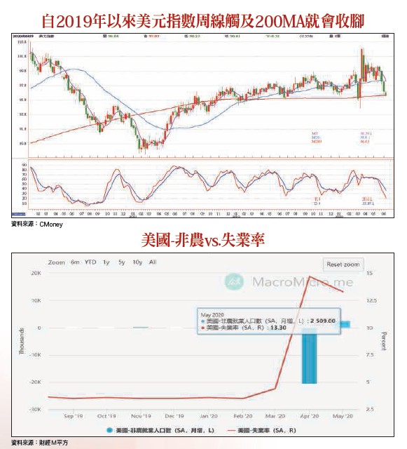 由就業市場來觀察,美國勞工局公布的五月份非農就業新增人數為二五○.九萬人,跌破全市場眼鏡,不但遠優於上個月的減少二○六八.七萬人,亦遠超過華爾街分析師預期的減少八三三萬人。