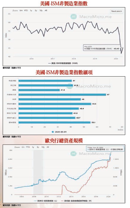 我們再由領先指標之一的美國ISM非製造業採購經理人指數(PMI)的面向觀察。美國非製造業(服務業)PMI指數由四月的四一.八上升至五月份的四五.四,衰退程度減緩。