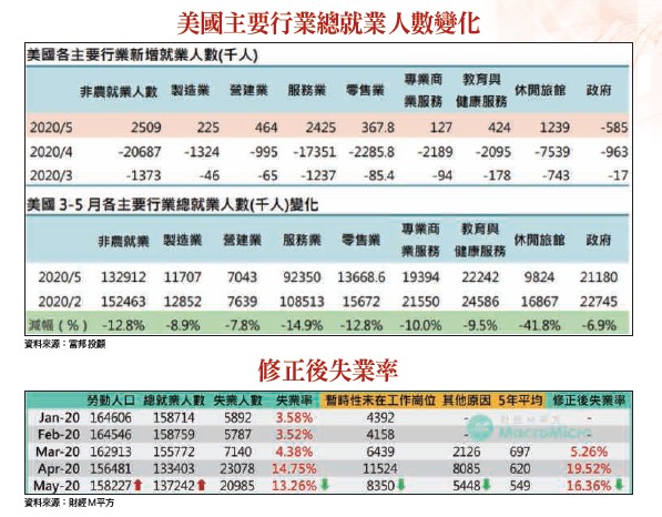 不過,若是暫時不看絕對數字,以方向性的發展,五月份不論是修正前或修正後的數據都是「轉折向下」,這絕對是正向發展。五月就業市場回復主要是因為美國各州已陸續解封,經濟活動逐步回復正常,可由餐飲與零售業等服務業人數增加得到印證。