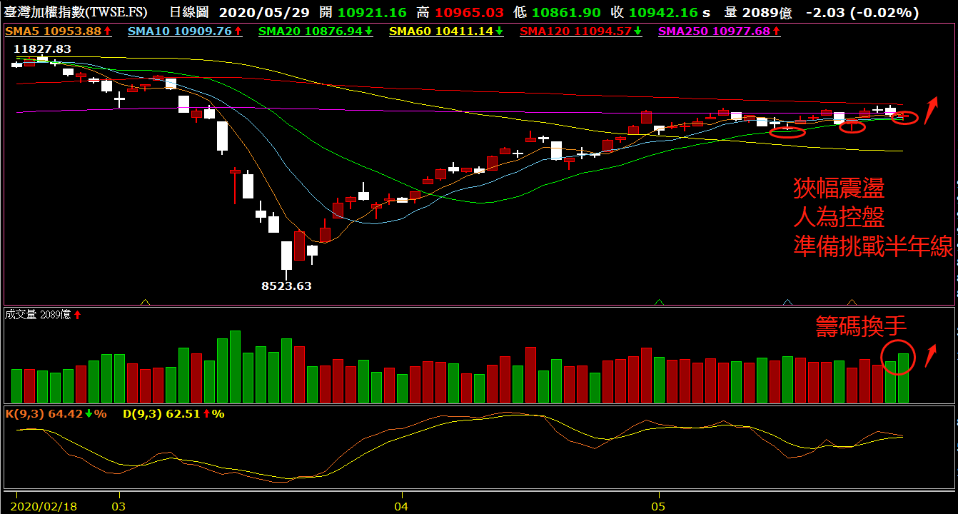 5月29日台灣加權指數跌2.03點,收10942.16點,量增價跌的十字陽線,雖然沒能收在平盤之上,但是開低走高的過程達到了洗盤的籌碼換手作用,看到了多頭的堅守20日均線的企圖心,重複了5月21~25日的回測20日均線走勢,儘管今晚川普要針對大陸召開記者會,但預期在6月5日的大非農就業報告與10-11日的FOMC利率決策會議之前,市場會進入觀望等待的階段,估計短期將繼續量縮狹幅震盪。保持看多,關注投信作帳的鎖碼股。
