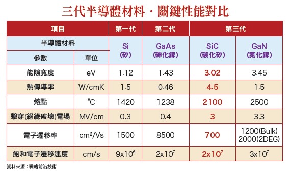 碳化矽材料突出的物理特性,主要為:能隙寬度大、擊穿(絕緣破壞)電場高、導熱率高、電子飽和速率高、抗輻射能力強;同時,亦較傳統矽基材料具備更高度的電流功率耐受力(因擊穿電場高)。