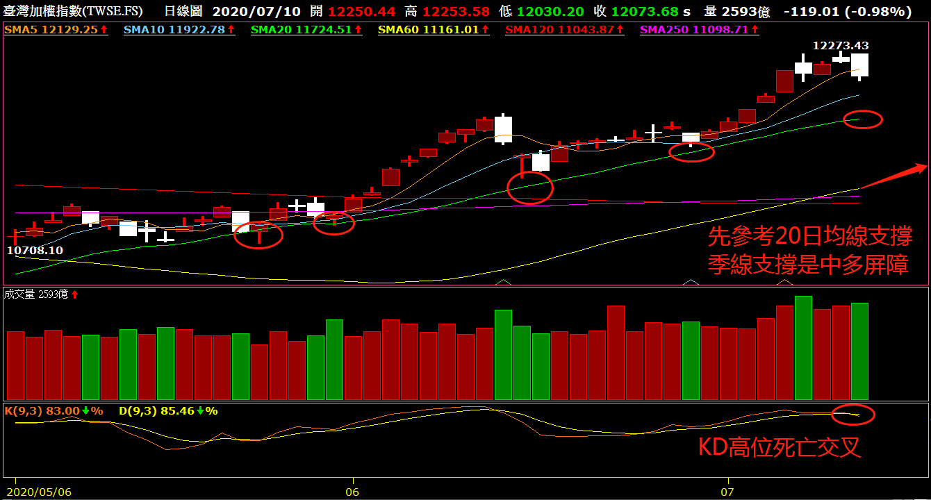 7月10日台灣加權指數跌119.01點,收12073.68點,增量的實體陰線,跌破5日均線,7~10日共出現3次陰線,顯示空頭的氣勢開始上升,日KD在高位死亡交叉,而且收盤價正好跌破12080點的八分之一甘氏角,進入到整理格局。目前20日均線多次成為下方支撐,因此11724點附近為較可靠的支撐參考,此價位正好是10日收盤價的四分之一甘氏角,如果守住,則中多仍可持續。由於台積電還沒有正式轉弱,推測可能採取區間震盪整理模式,