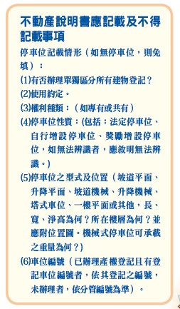 有關停車位及資訊揭露議題,請參閱內政部所公布之「不動產說明書應記載及不得記載事項」對於停車位之相關規定如附表,小基地建案應詳細註明清楚,俾免日後衍生無謂紛擾!