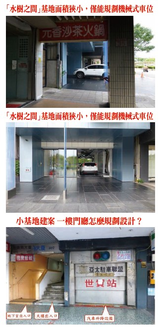 小基地建案由於基地面積狹小,如再加上狹長地形,面寬不足,必然很難規劃出坡道平面車位,僅能仰賴機械升降停車,甚至汽車載運至地下室之後,還需借助轉盤移動方向,尤其是停留騎樓出入口等候機械升降時,經常發生阻礙行人情事,如係坐落於繁華商圈,恐滋生無謂困擾(詳請參閱照片),另外,一旦發生機械故障,甚或壓傷人車等問題,也可能衍生理賠等紛擾。