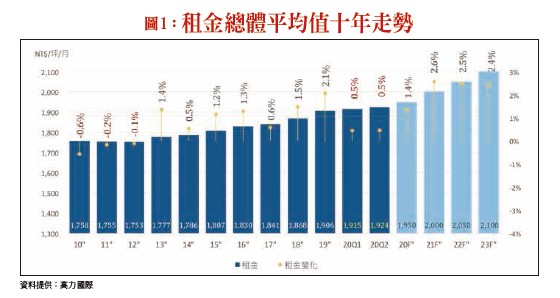 她說,由租金總體平均值的十年走勢來看,目前呈現一年比一年高的走勢(圖一),預期整體平均租金仍持續上漲,預估接下來兩季漲勢將持續。