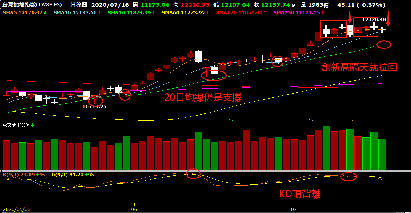 7月16日台灣加權指數跌45.11點,收12157.74點,量縮價跌的十字陰線,連跌3天終於跌破5日均線,明天的台積電將是多頭的希望,雖上調資本支出與第三季營收,但第三季毛利率與營益率下滑,今天台積電收跌,可能就是領先反應第三季的獲利可能不如預期的利空,至於明天要不要反應資本支出增加的利多,攸關到加權指數的12250點壓力能不能重新站上。